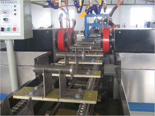 本設(shè)備采用手動(dòng)、自動(dòng)兩種運(yùn)行方式,由可編程控制器(PLC)集中控制。手動(dòng)時(shí),可進(jìn)行每個(gè)功能的單步獨(dú)立操作;自動(dòng)時(shí),設(shè)備自動(dòng)執(zhí)行PLC內(nèi)部程序,初始狀態(tài)時(shí),工件經(jīng)人工排料至上料機(jī)構(gòu)后,按“上料”——“傳送”鍵,直至探傷兩工位有工件后即按“啟動(dòng)”鍵可自動(dòng)執(zhí)行電極夾緊——噴淋——磁化——一次傳送上料——二次傳送上料等一系列動(dòng)作。周向磁化采用直接通電,縱向磁化采用線圈,具有良好的磁化效果。復(fù)合磁化在工件上形成旋轉(zhuǎn)磁場(chǎng),一次性顯示磁跡,具有較高的工作效率。