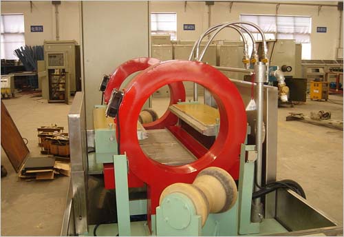 采用通過式結(jié)構(gòu),適用于直徑90㎜到250㎜、長度4m—10m圓鋼的磁粉檢測。由電源控制柜、磁化系統(tǒng)、熒光檢測系統(tǒng)、磁懸液噴灑、回收系統(tǒng)等幾大部分組成。適用于以濕式磁粉法檢測圓鋼的表面及近表面因鑄造、材料等各種原因引起的裂紋和各種細(xì)微缺陷。