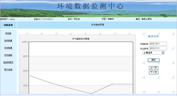 (2)左側(cè)為功能選擇鍵。分為“手機(jī)版”,“實時數(shù)據(jù)”,“歷史數(shù)據(jù)”,“歷史曲線”,“返回列表頁”,“用戶注銷”等功能。