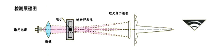 由一個(gè)特制的半導(dǎo)體制冷恒溫激光光源,發(fā)出的激光經(jīng)濾波處理,通過(guò)透鏡照到樣品池,當(dāng)樣品池中無(wú)顆粒時(shí),激光會(huì)聚在探測(cè)器中心,當(dāng)樣品池中有顆粒,激光被散射,散射出來(lái)的相同方向的光聚焦到焦平面上,在這個(gè)平面上放置一個(gè)優(yōu)良設(shè)計(jì)的硅光電二極管扇形光靶檢測(cè)器,用來(lái)接收散射光能的分布,光電檢測(cè)器把照射到每個(gè)環(huán)面上的散射光能轉(zhuǎn)換成相應(yīng)的信號(hào),在這些電信號(hào)中包含有顆粒粒徑大小及分布的信息,電信號(hào)經(jīng)放大和模數(shù)轉(zhuǎn)換后一起送入計(jì)算機(jī),計(jì)算機(jī)根據(jù)測(cè)得的各個(gè)環(huán)上的衍射光能值按預(yù)先編好的計(jì)算機(jī)程序可以很快地解出被測(cè)顆粒的平均粒徑及尺寸分布,計(jì)算結(jié)果在顯示屏上顯示或由打印機(jī)輸出。
