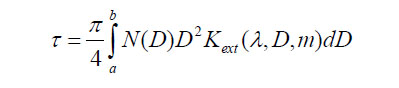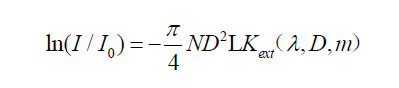 式中Kext 稱為消光系數(shù)(Extinction Coefficient),是入射光波長(zhǎng)λ、被測(cè)顆粒直徑D、顆粒相對(duì)于周圍介質(zhì)的相對(duì)折射率m(= n ? iη )的函數(shù),可以由經(jīng)典Mie 光散射理論計(jì)算得到。將式(4)代入式(3)后可得